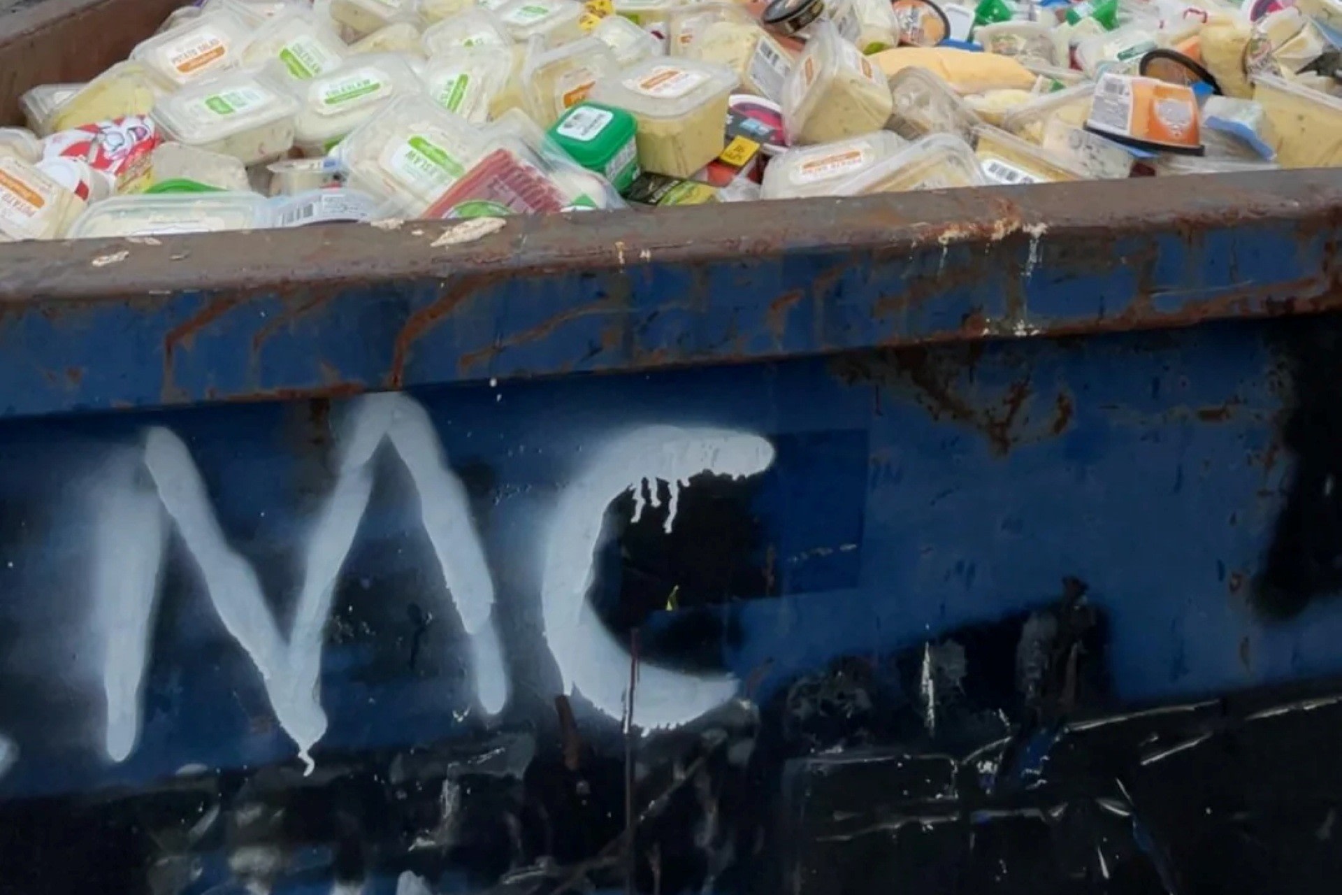 They then attached two photos: one showing a dumpster in the process of being filled with assorted cheeses and another where the massive container had been filled to the brim with other refrigerated products such as premade dips.