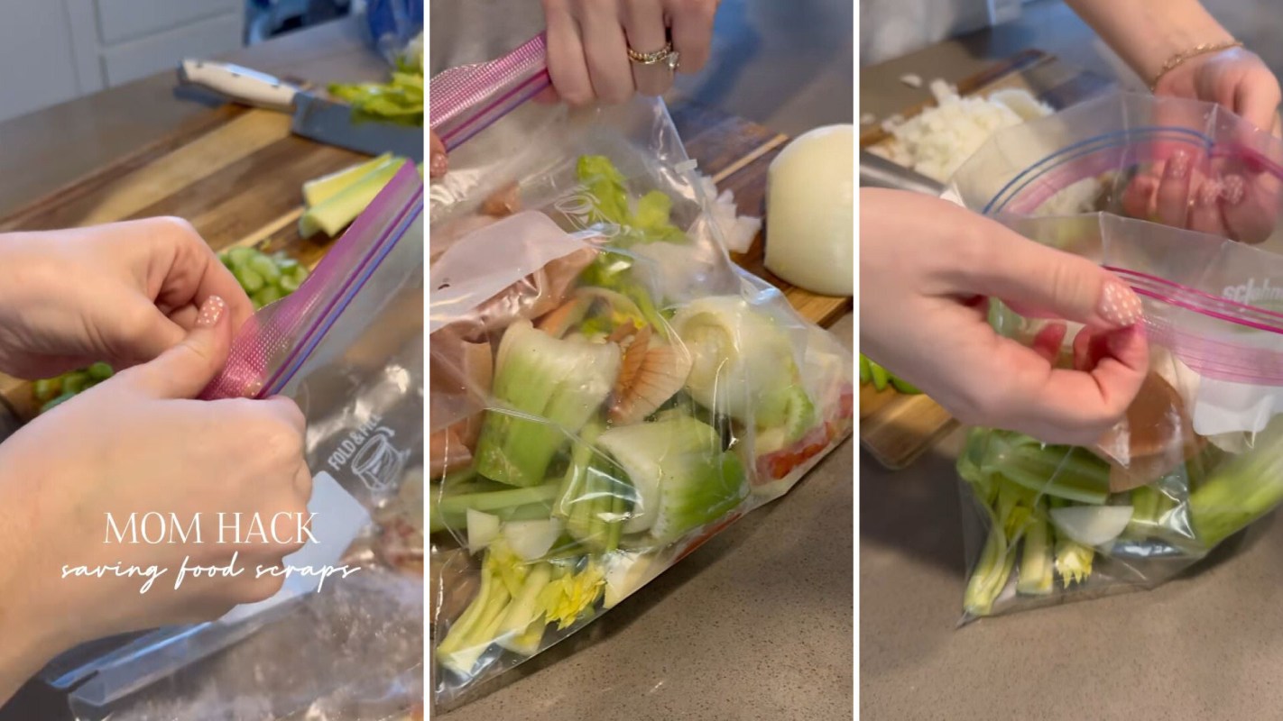 Summer (@whatiloveabout.summer) shared their "mom hack" for saving food scraps. "No more food waste in this house," the caption reads.